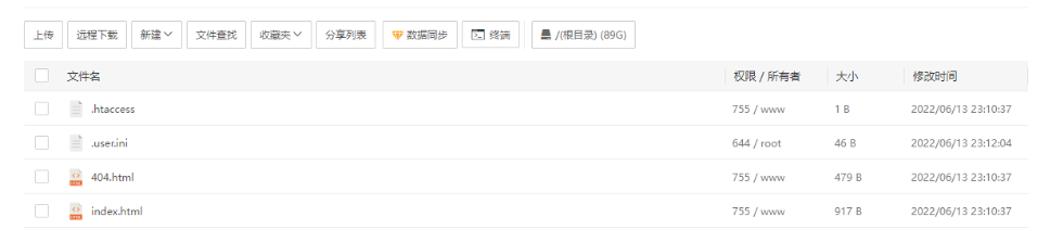 点击这个链接已经可以看到网站根目录下的文件,这是宝塔默认生成的几个文件,后面部署网站源码时,这些都可以删除不要。
