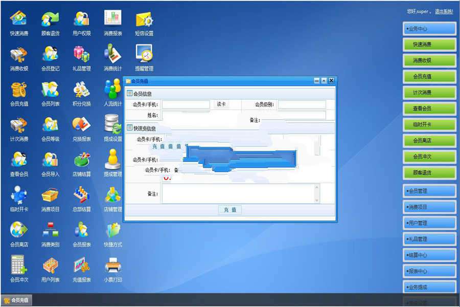◆业务中心(快速消费 消费收银 会员充值 计次消费 查看会员 临时开卡 会员离店 会员冲次 顾客退货)